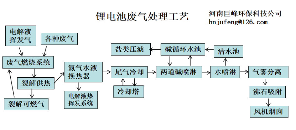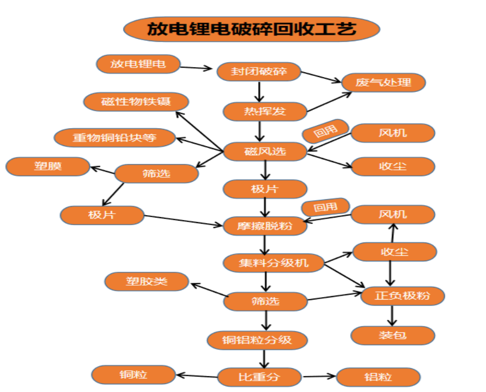 把鋰電放電后給料為封閉破機進料, 碎后料進加熱輸送進行電解質熱揮發把低于140度電解液進行揮發(確保鋰電池放電到安全電壓1.3V以下,因高電壓使鋰電破碎料在熱揮發時產生有機氣體爆炸危險,并且盡量用惰性氣體進行熱揮發,盡量避免氧氣進入,熱揮發氣體要單獨進行輸送避免和其它含氧氣體混合產生爆炸隱患),揮發后物料經過綜合分選把磁性物鐵鎳,塑膜、較重金屬極塑膠和正負極片,正負極片進摩擦脫粉再進行氣流風選和篩選,把金屬粒和極粉分離,銅鋁經過篩選和比重分選進行分離,生產各處產生的廢氣經各自管道進行輸送至廢氣處理系統進行達標排放。