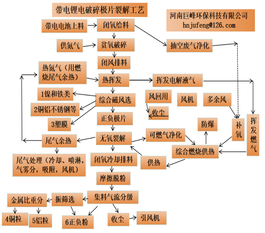 帶電鋰電池在惰性氣保護下貧氧破碎、閉風排料、貧氧熱揮發、磁風選等工序,把鐵、塑殼、不銹鋼、銅鋁、塑膜分選出,揮發電解氣進燃燒系統燃燒處理,分出極片進裂解爐,可燃氣進燃燒系統供熱,裂解后極片經冷卻、摩擦脫粉、篩選、比重分、除塵等工序將極粉,銅粒,鋁粒分離;燃燒尾氣經冷卻、堿噴淋、水噴淋、氣霧分離和吸附過濾外排。