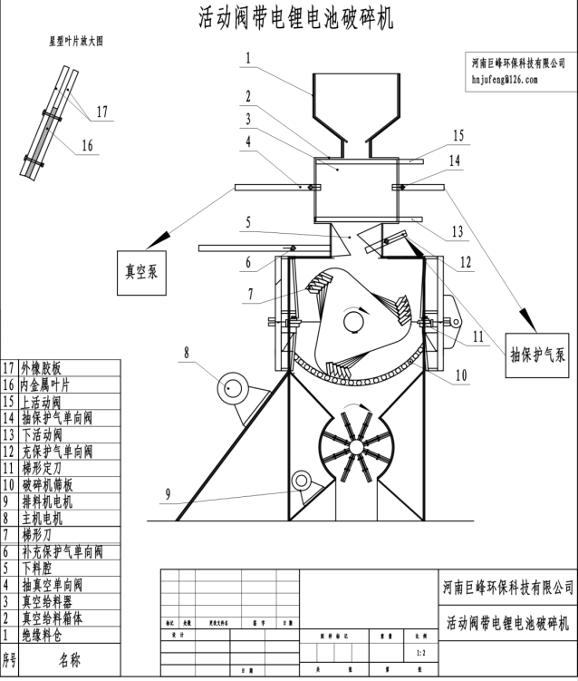 鋰電池經(jīng)絕緣倉進活動閥真空給料,下閥關(guān)上閥開,進料后上閥關(guān),關(guān)后抽空,抽后下閥開入破室,下閥關(guān)給料器腔抽氣,完成給料工序;物料經(jīng)Z腔至破室,Z腔防止物料反彈,破室在貧氧狀(破碎室含氧量在小于2%以下可保證帶電破碎的正常安全性),破室進出料閉氧抽空充惰性氣體(常規(guī)用氮氣和二氧化碳);惰性氣體作用為提高電解液閃點和揮發(fā)點,同時抑制鋰離子從負極到正極幾率,防止放電發(fā)熱和爆燃;鋰電破碎時轉(zhuǎn)子刀與底刀相切破,并起摩擦打散防止金屬殼體包裹正負極片,碎后物料通過真空排料進行外排。