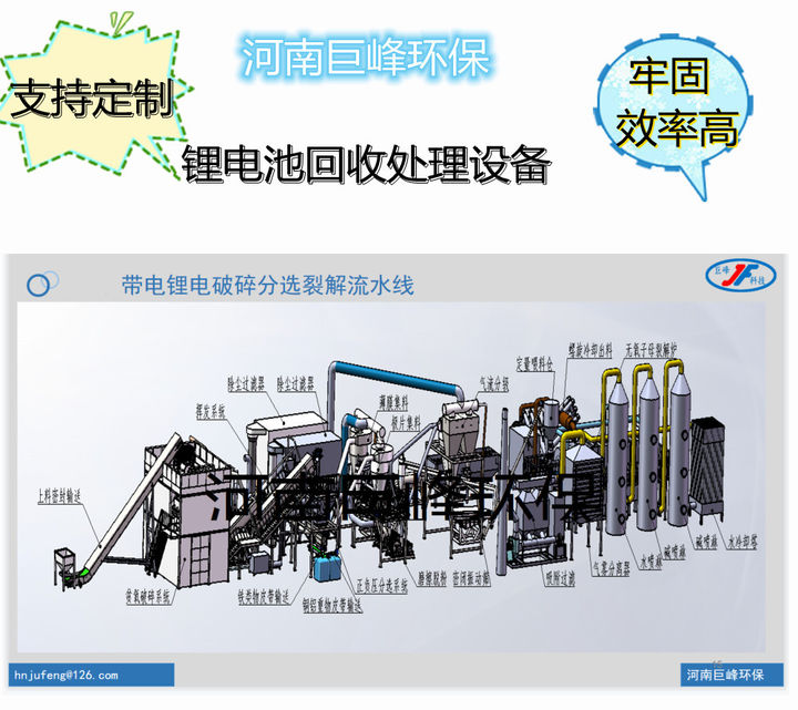3.全資源化利用,塑膠隔膜和金屬分選出各種利用;抽空廢氣、熱揮發氣,各個分選多余廢氣及裂解可燃氣進行綜合燃燒供熱,燃燒尾氣余熱電解液揮發再利用,燃燒尾氣經簡單處理達標排放,各種資源得到綜合合理利用。